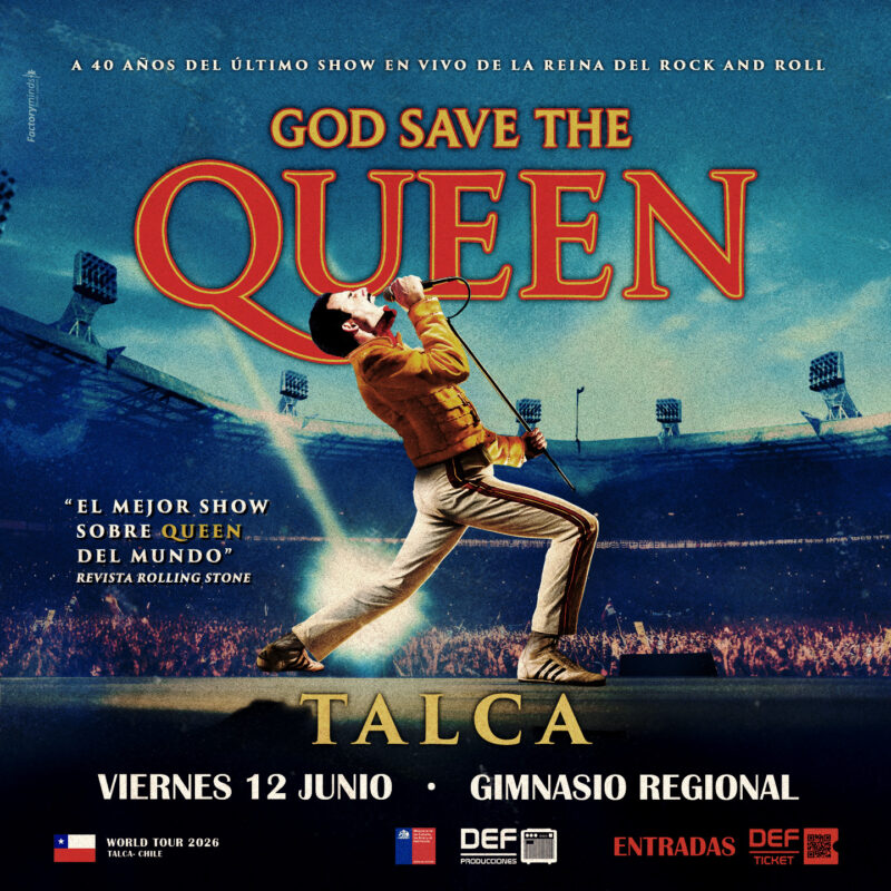 Celebrando 40 años del último concierto de la Reina del Rock & Roll – el mejor shows sobre Queen del mundo – God Save The Queen / Dios Salve a la Reina regresa a Talca, luego de un sold out increible, ahora con nuevo espectáculo, que lo hará circular por todo el planeta…
